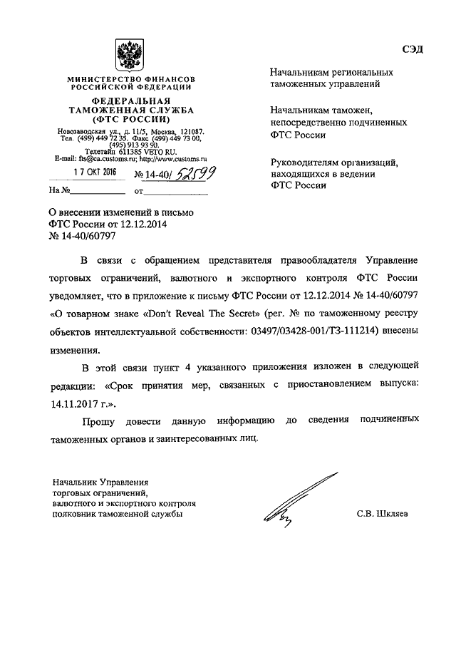 ПИСЬМО ФТС РФ от 17.10.2016 N 14-40/52599