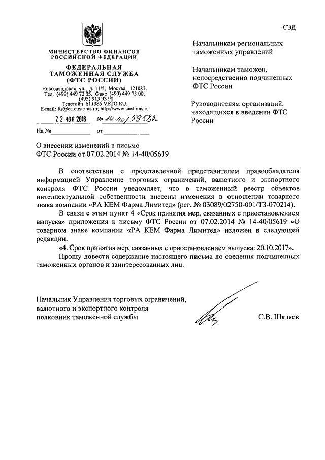 ПИСЬМО ФТС РФ от 23.11.2016 N 14-40/59582