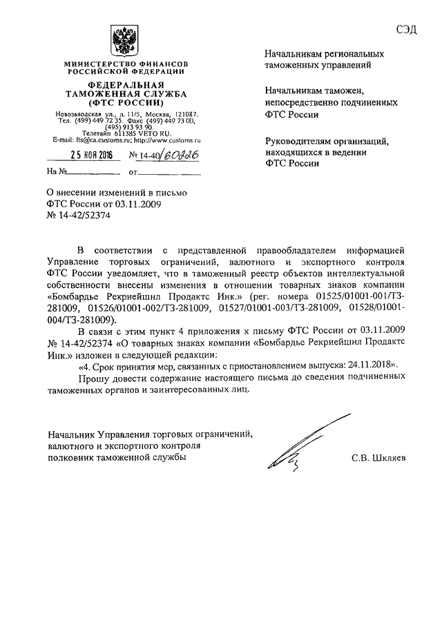ПИСЬМО ФТС РФ от 25.11.2016 N 14-40/60226