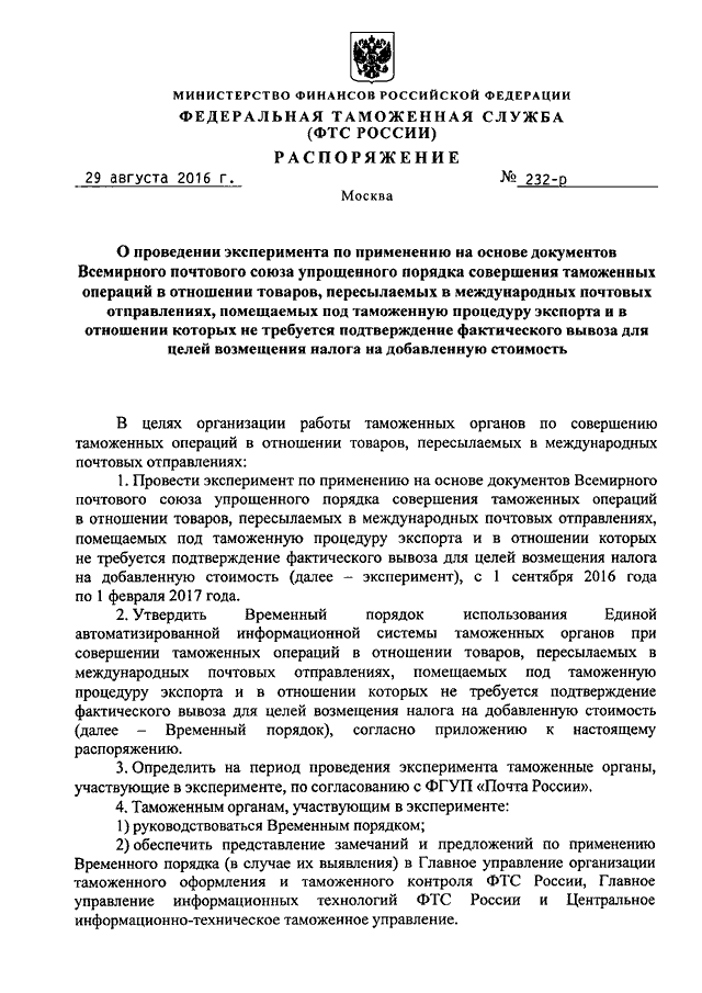 РАСПОРЯЖЕНИЕ ФТС РФ от 29.08.2016 N 232-р "О ПРОВЕДЕНИИ ЭКСПЕРИМЕНТА ПО ПРИМЕНЕНИЮ НА ОСНОВЕ ДОКУМЕНТОВ