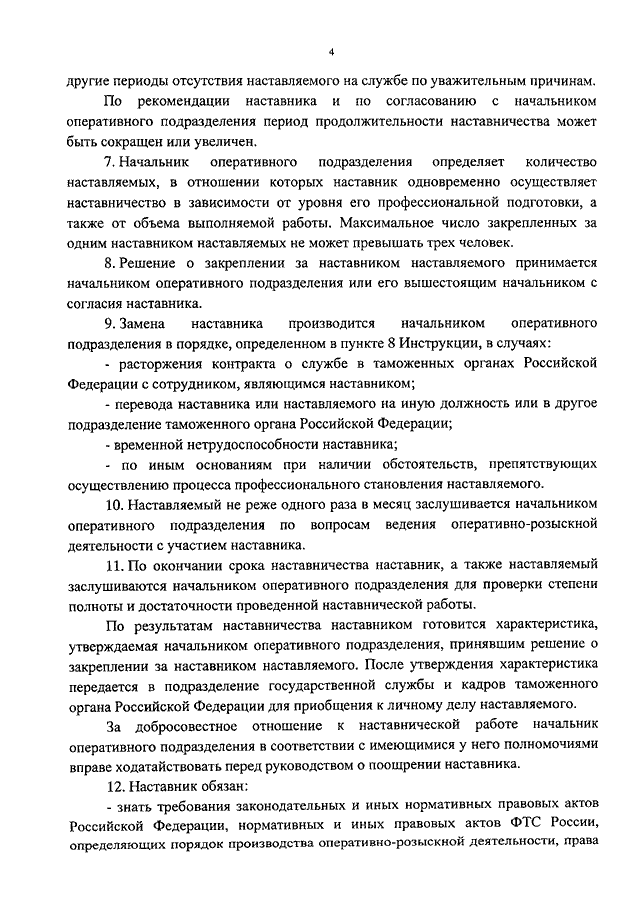 "ОБ УТВЕРЖДЕНИИ ИНСТРУКЦИИ О НАСТАВНИЧЕСТВЕ В ОПЕРАТИВНЫХ ПОДРАЗДЕЛЕНИЯХ ТАМОЖЕННЫХ ОРГАНОВ РОССИЙСКОЙ ФЕДЕРАЦИИ"