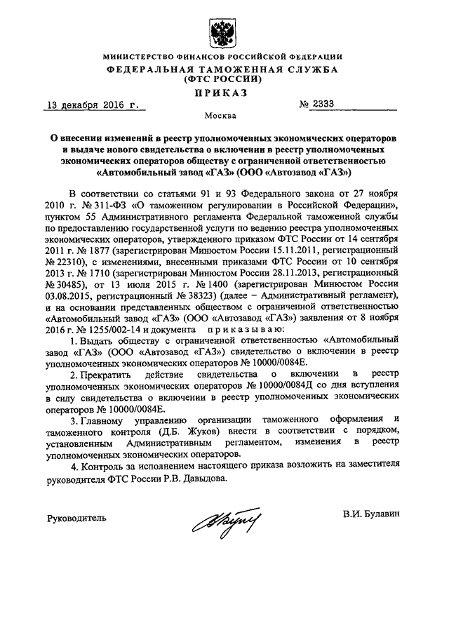 ПРИКАЗ ФТС РФ от 13.12.2016 N 2333 "О ВНЕСЕНИИ ИЗМЕНЕНИЙ В РЕЕСТР УПОЛНОМОЧЕННЫХ ЭКОНОМИЧЕСКИХ