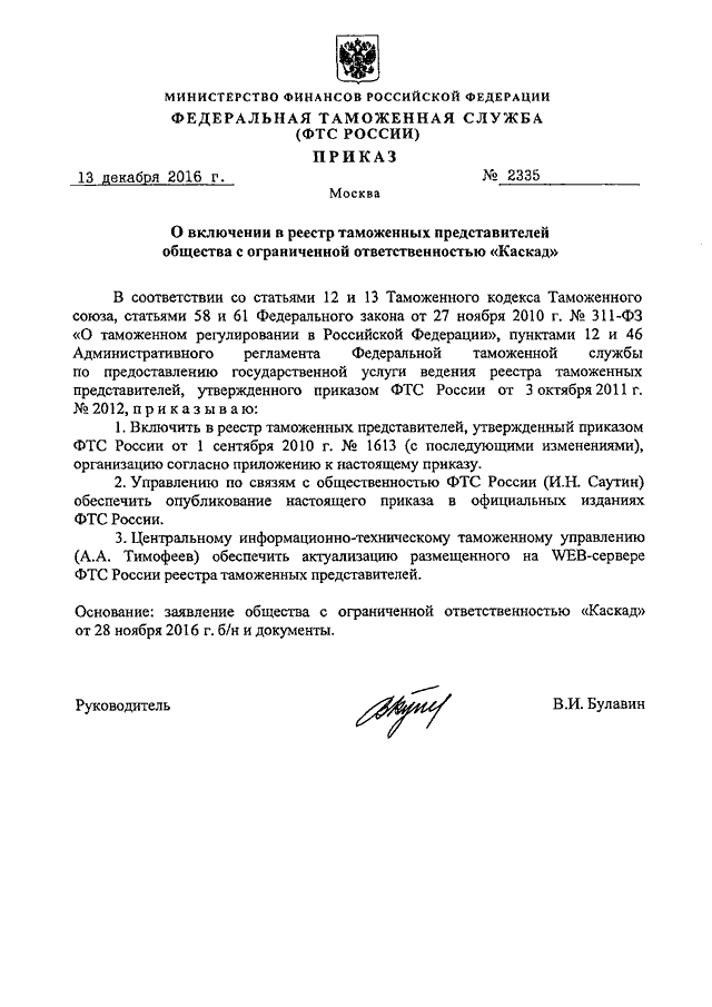 ПРИКАЗ ФТС РФ от 13.12.2016 N 2335