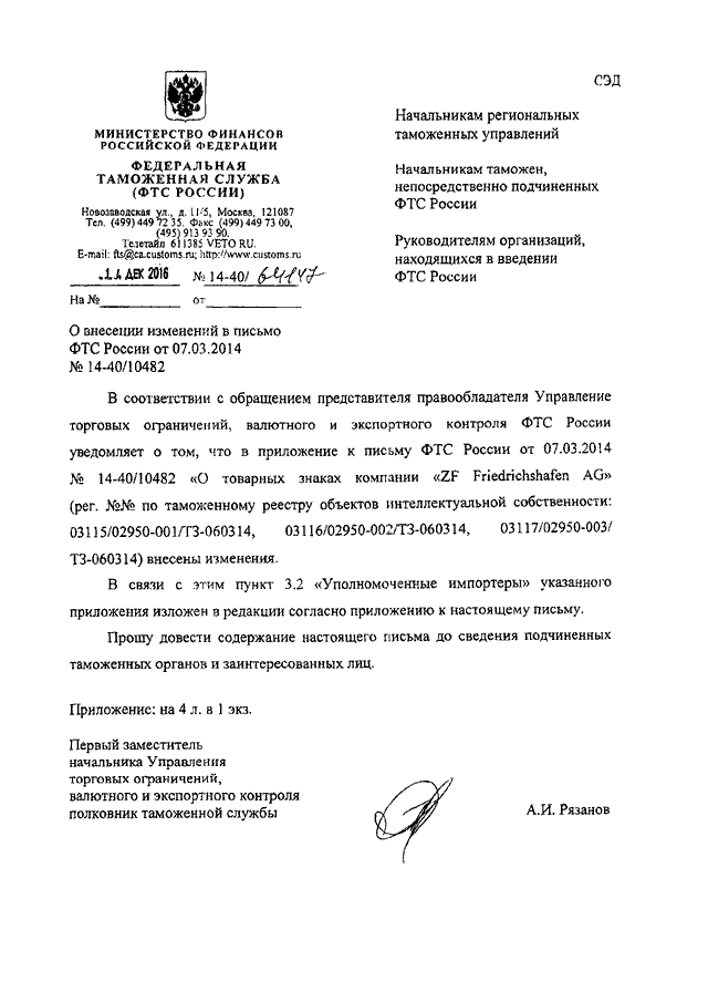 "О ВНЕСЕНИИ ИЗМЕНЕНИЙ В ПИСЬМО ФТС РОССИИ ОТ 07.03.2014 N 14-40/10482"
