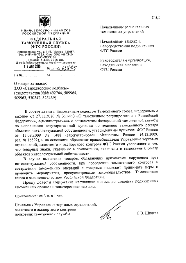 ПИСЬМО ФТС РФ от 13.12.2016 N 14-40/63765