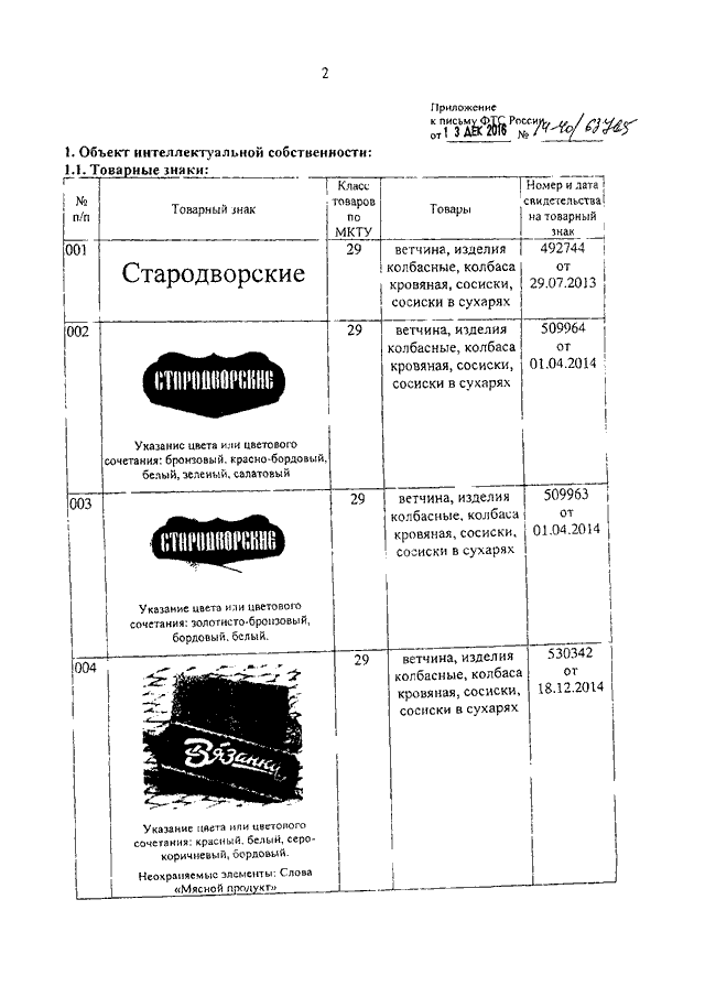 "О ТОВАРНЫХ ЗНАКАХ ЗАО "СТАРОДВОРСКИЕ КОЛБАСЫ" (СВИДЕТЕЛЬСТВА NN 492744, 509964, 509963, 530342, 525439)"