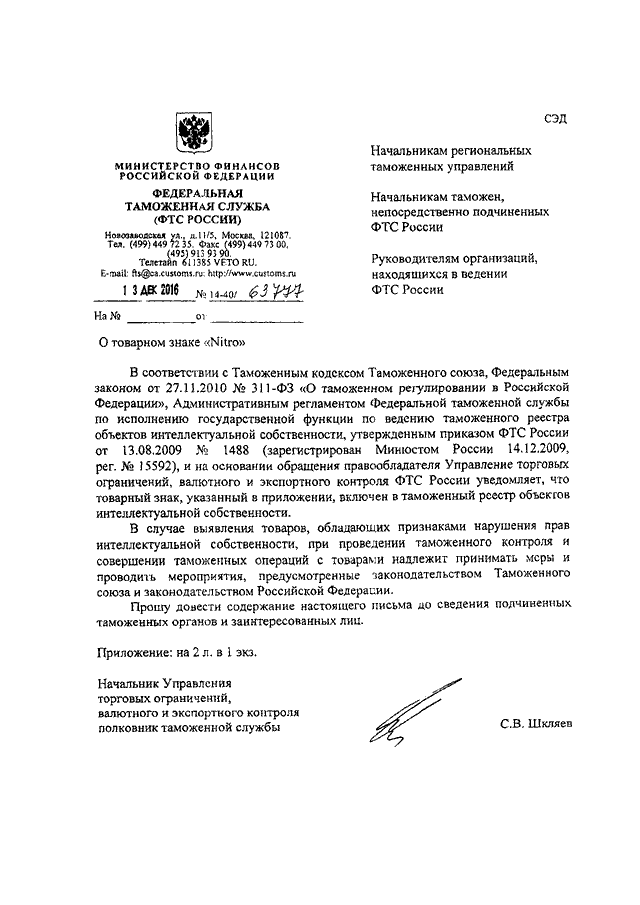 ПИСЬМО ФТС РФ от 13.12.2016 N 14-40/63777