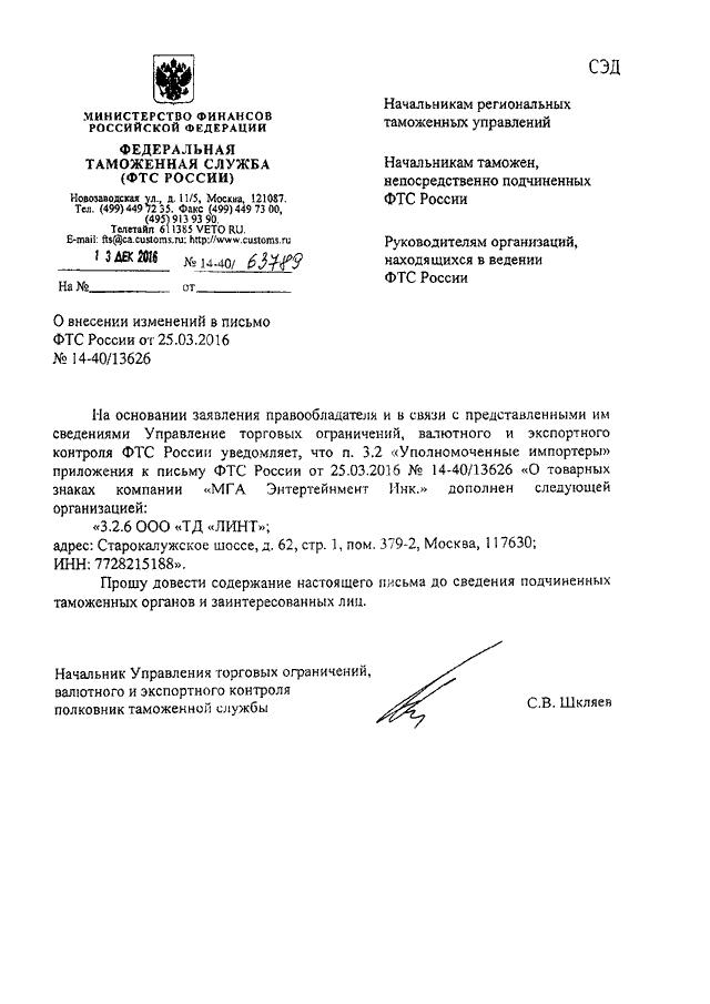 ПИСЬМО ФТС РФ от 13.12.2016 N 14-40/63789
