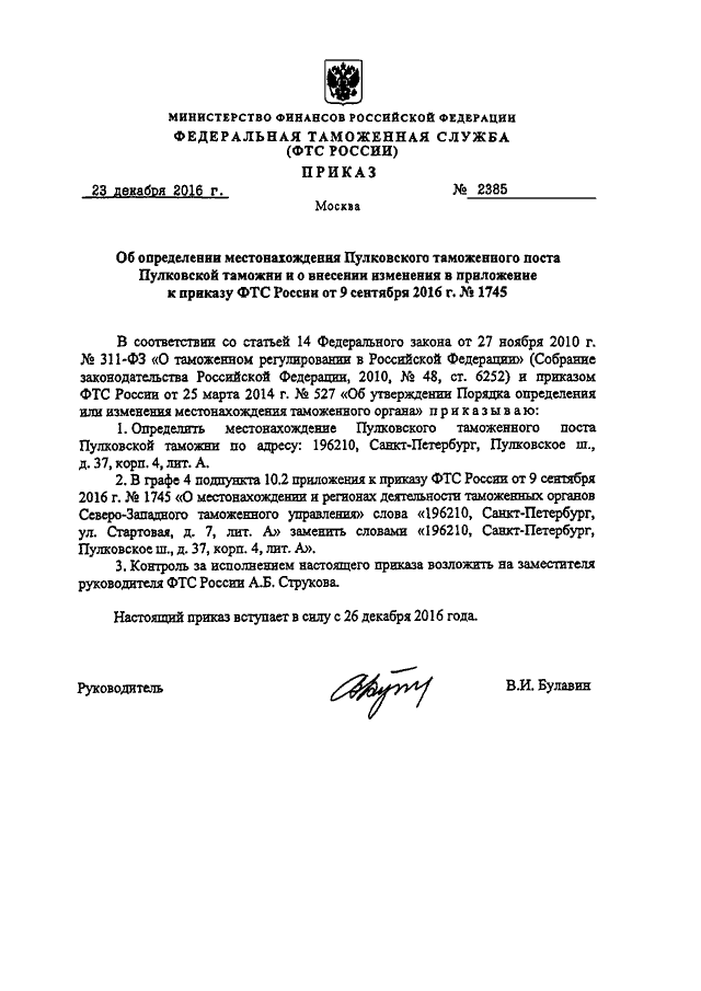 "ОБ ОПРЕДЕЛЕНИИ МЕСТОНАХОЖДЕНИЯ ПУЛКОВСКОГО ТАМОЖЕННОГО ПОСТА ПУЛКОВСКОЙ ТАМОЖНИ И О ВНЕСЕНИИ ИЗМЕНЕНИЯ В ПРИЛОЖЕНИЕ К ПРИКАЗУ ФТС РОССИИ ОТ 9 СЕНТЯБРЯ 2016 Г. N 1745"