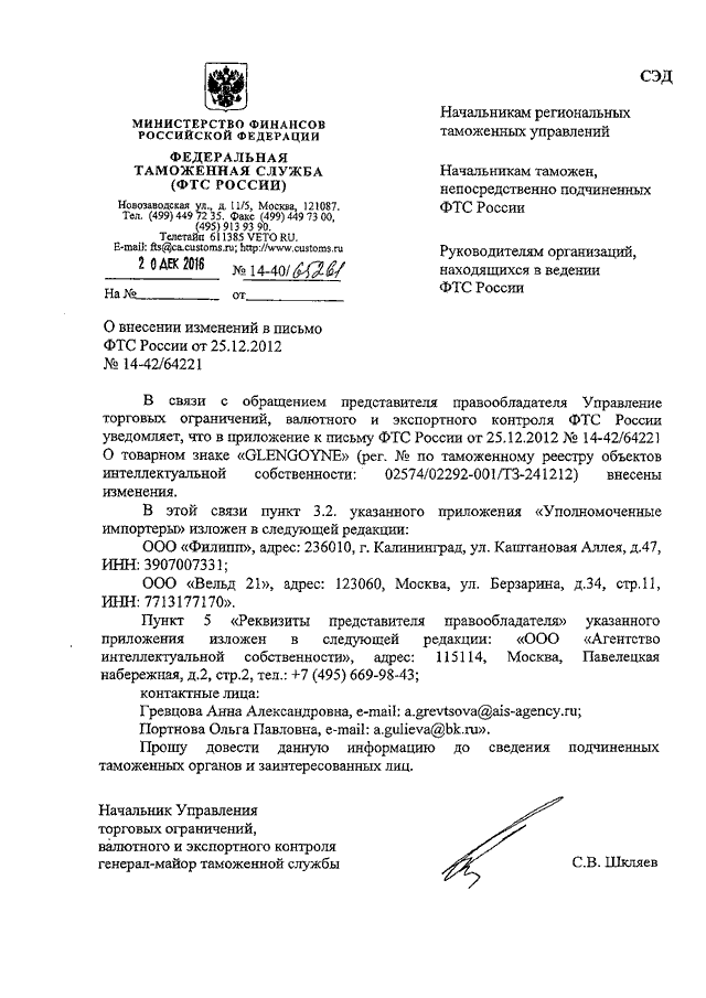 "О ВНЕСЕНИИ ИЗМЕНЕНИЙ В ПИСЬМО ФТС РОССИИ ОТ 25.12.2012 N 14-42/64221"
