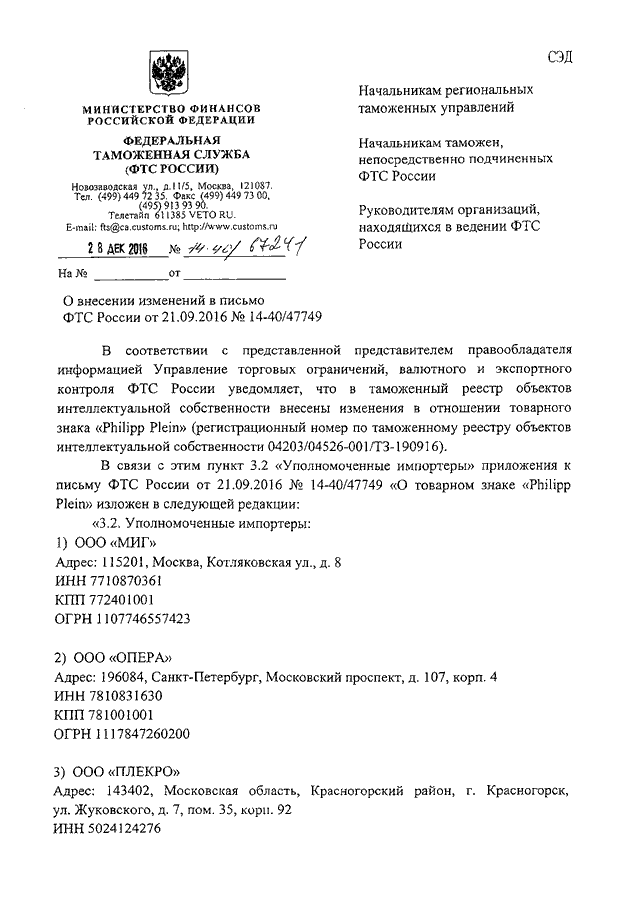 "О ВНЕСЕНИИ ИЗМЕНЕНИЙ В ПИСЬМО ФТС РОССИИ ОТ 21.09.2016 N 14-40/47749"