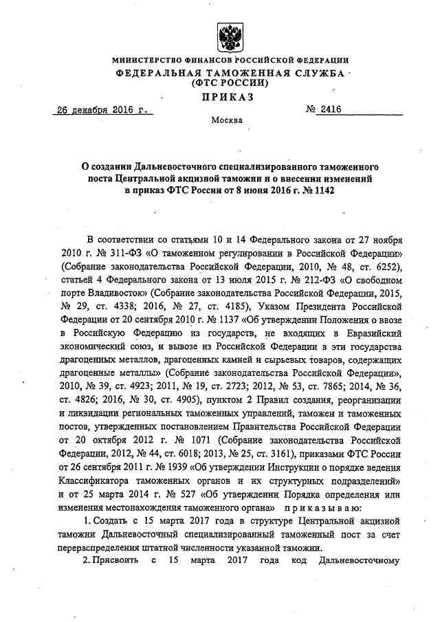 ПРИКАЗ ФТС РФ от 26.12.2016 N 2416
