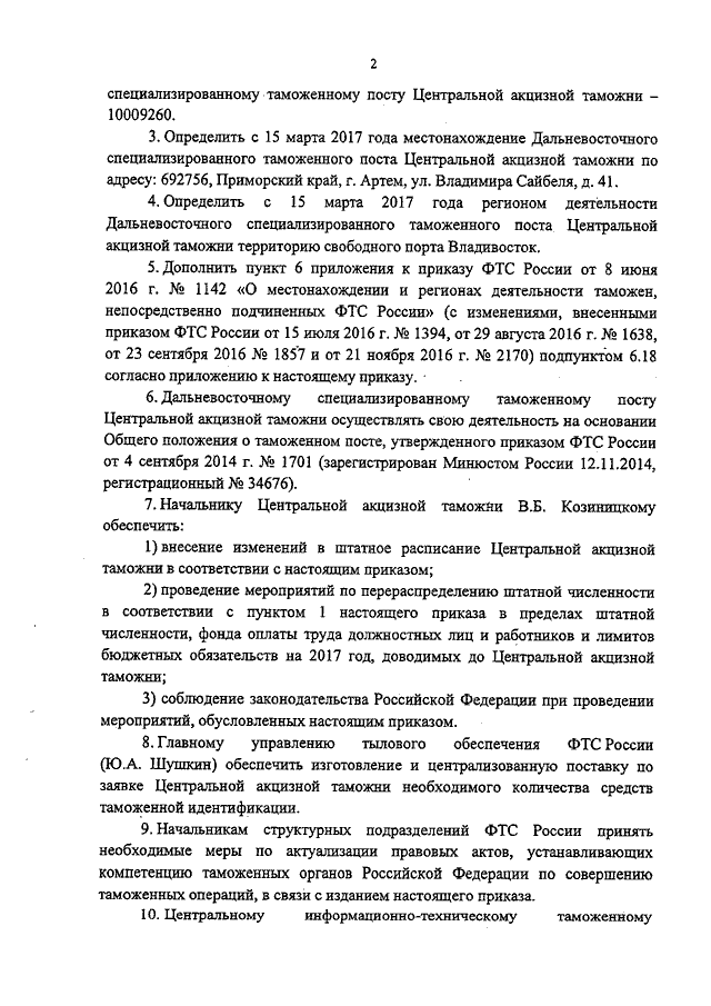 "О СОЗДАНИИ ДАЛЬНЕВОСТОЧНОГО СПЕЦИАЛИЗИРОВАННОГО ТАМОЖЕННОГО ПОСТА ЦЕНТРАЛЬНОЙ АКЦИЗНОЙ ТАМОЖНИ И О ВНЕСЕНИИ ИЗМЕНЕНИЙ В ПРИКАЗ ФТС РОССИИ ОТ 8 ИЮНЯ 2016 Г. N 1142"