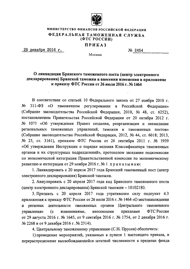 ПРИКАЗ ФТС РФ от 29.12.2016 N 2454