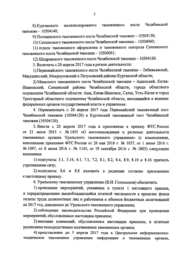 "О ЛИКВИДАЦИИ ТАМОЖЕННЫХ ПОСТОВ, РАСПОЛОЖЕННЫХ В УРАЛЬСКОМ ФЕДЕРАЛЬНОМ ОКРУГЕ, И О ВНЕСЕНИИ ИЗМЕНЕНИЙ В ПРИЛОЖЕНИЕ К ПРИКАЗУ ФТС РОССИИ ОТ 21 ИЮЛЯ 2015 Г. N 1455"