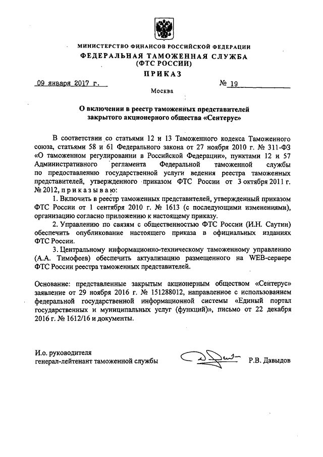 ПРИКАЗ ФТС РФ от 09.01.2017 N 19