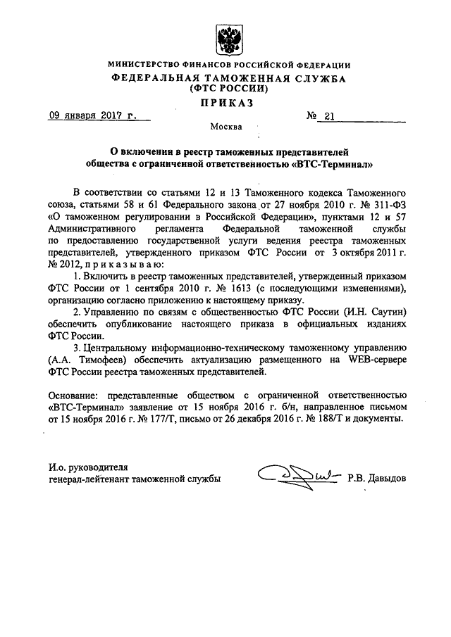 ПРИКАЗ ФТС РФ от 09.01.2017 N 21