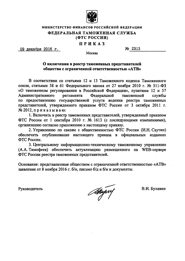 ПРИКАЗ ФТС РФ от 09.12.2016 N 2313