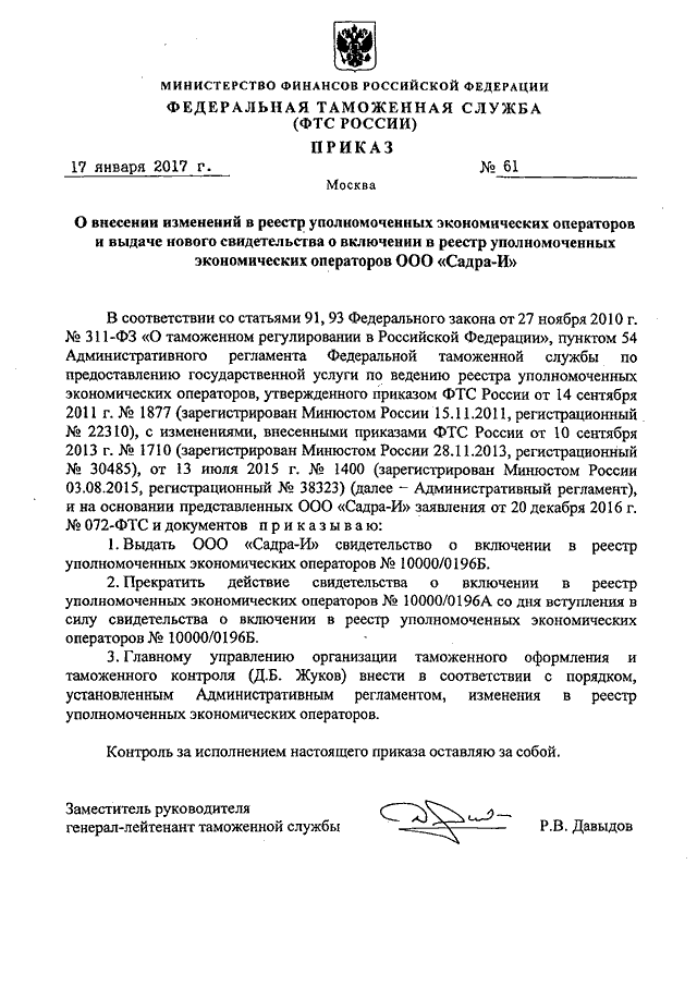 "О ВНЕСЕНИИ ИЗМЕНЕНИЙ В РЕЕСТР УПОЛНОМОЧЕННЫХ ЭКОНОМИЧЕСКИХ ОПЕРАТОРОВ И ВЫДАЧЕ НОВОГО СВИДЕТЕЛЬСТВА О ВКЛЮЧЕНИИ В РЕЕСТР УПОЛНОМОЧЕННЫХ ЭКОНОМИЧЕСКИХ ОПЕРАТОРОВ ООО "САДРА-И"