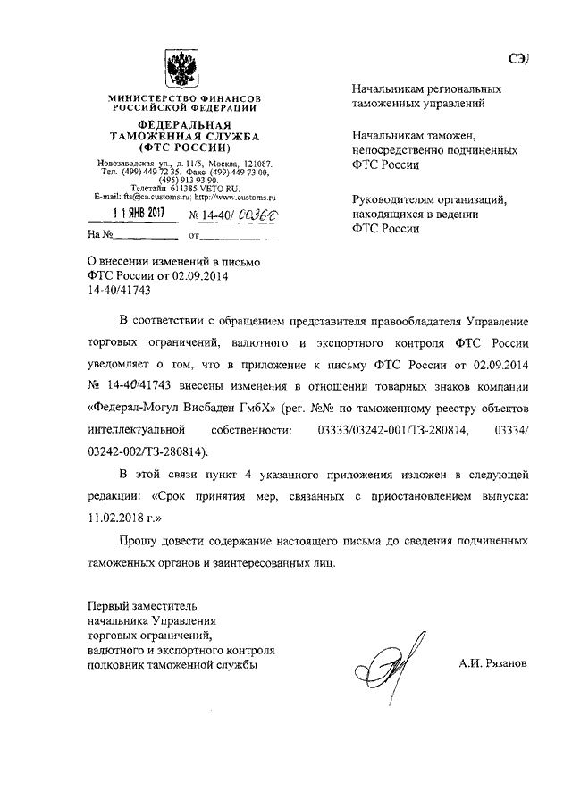 "О ВНЕСЕНИИ ИЗМЕНЕНИЙ В ПИСЬМО ФТС РОССИИ ОТ 02.09.2014 N 14-40/41743"