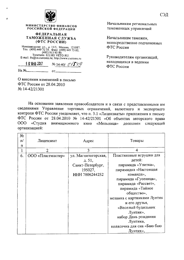 ПИСЬМО ФТС РФ от 18.01.2017 N 14-40/01549
