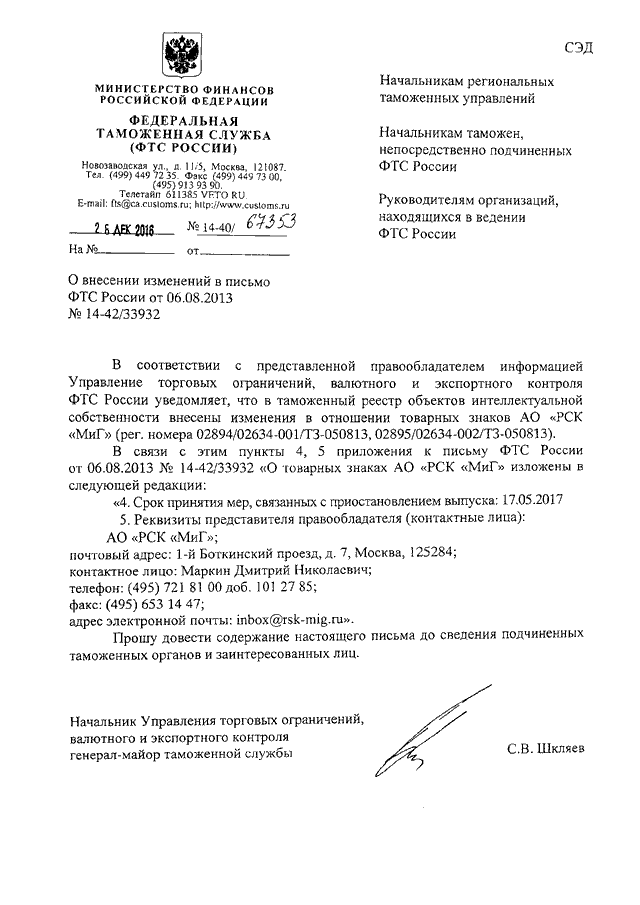 ПИСЬМО ФТС РФ от 28.12.2016 N 14-40/67353