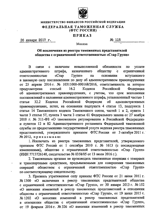 ПРИКАЗ ФТС РФ от 26.01.2017 N 118