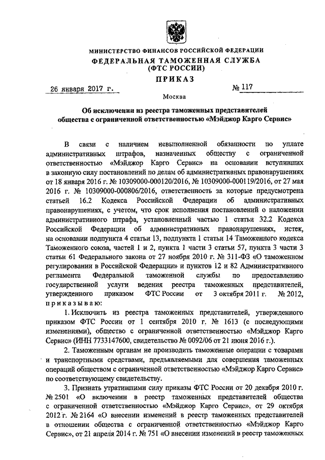 ПРИКАЗ ФТС РФ от 26.01.2017 N 117