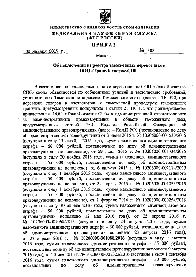 ПРИКАЗ ФТС РФ от 30.01.2017 N 132
