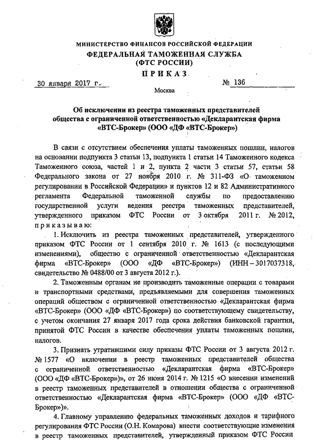 ПРИКАЗ ФТС РФ от 30.01.2017 N 136