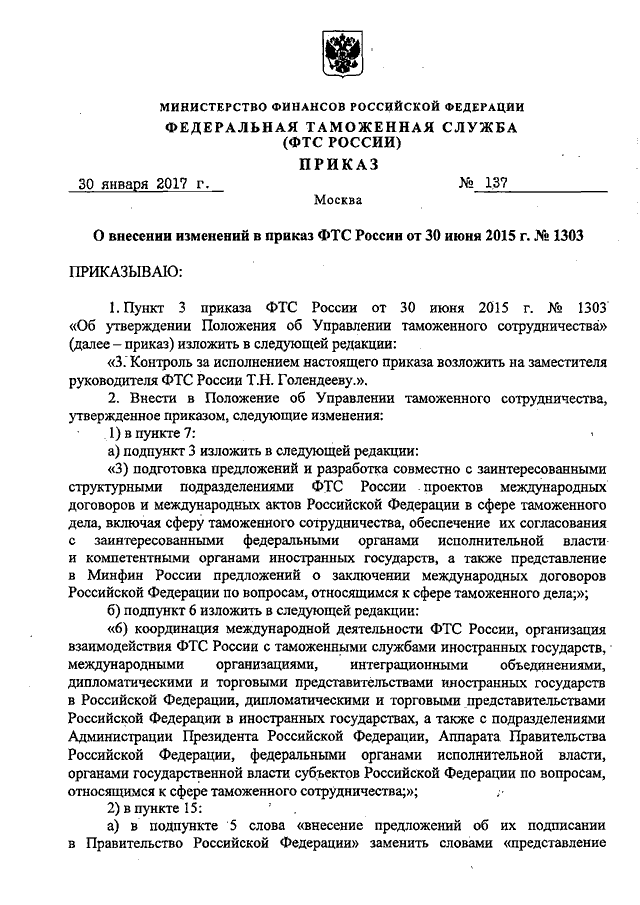 ПРИКАЗ ФТС РФ от 30.01.2017 N 137