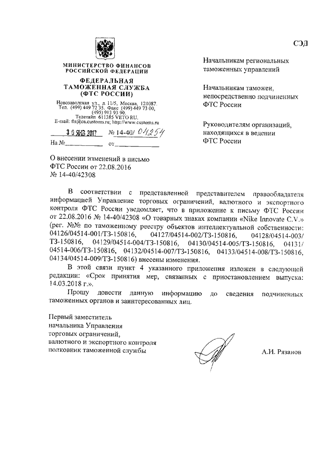 "О ВНЕСЕНИИ ИЗМЕНЕНИЙ В ПИСЬМО ФТС РОССИИ ОТ 22.08.2016 N 14-40/42308"