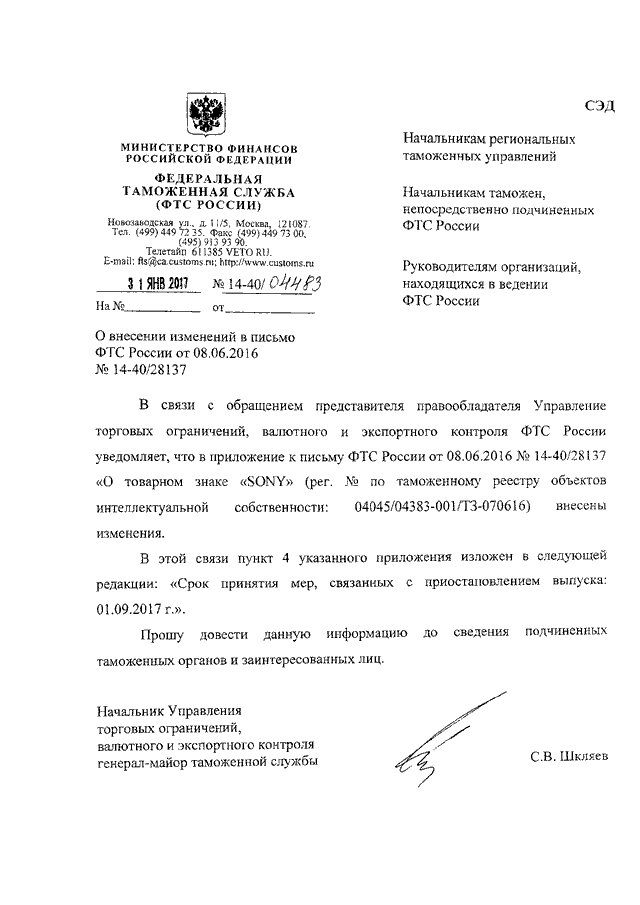 "О ВНЕСЕНИИ ИЗМЕНЕНИЙ В ПИСЬМО ФТС РОССИИ ОТ 08.06.2016 N 14-40/28137"
