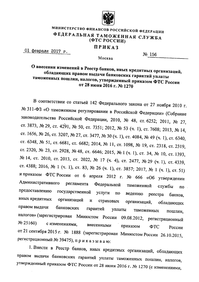 ПРИКАЗ ФТС РФ от 01.02.2017 N 156