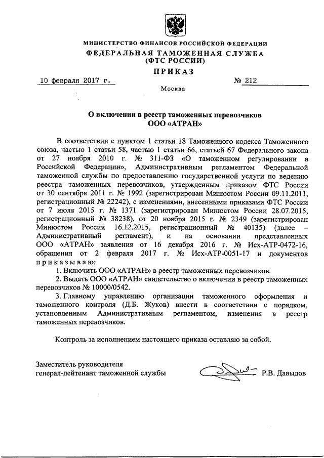 "О ВКЛЮЧЕНИИ В РЕЕСТР ТАМОЖЕННЫХ ПЕРЕВОЗЧИКОВ ООО "АТРАН"