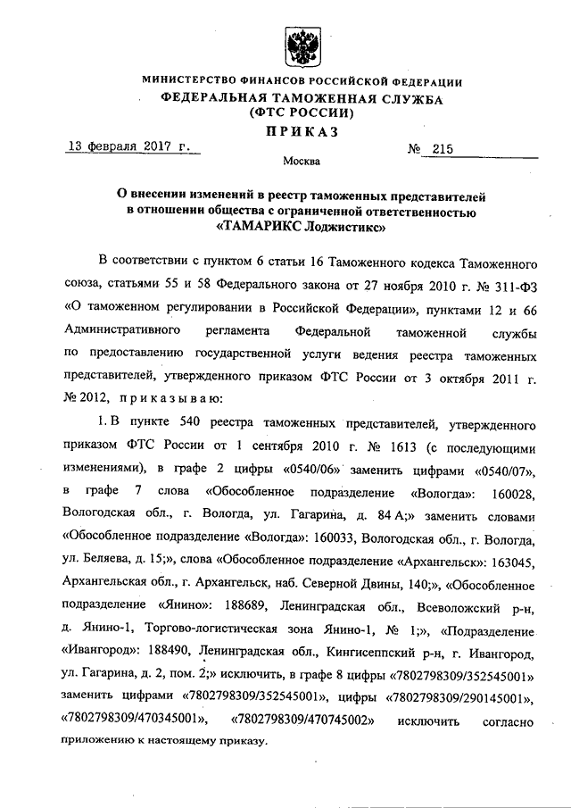 ПРИКАЗ ФТС РФ от 13.02.2017 N 215