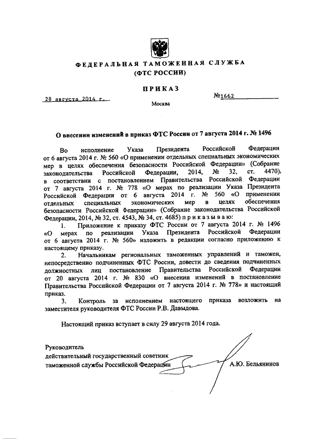 ПРИКАЗ ФТС РФ от 28.08.2014 N 1662