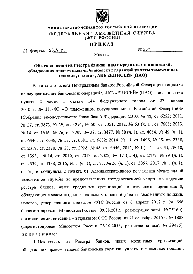 ПРИКАЗ ФТС РФ от 21.02.2017 N 267