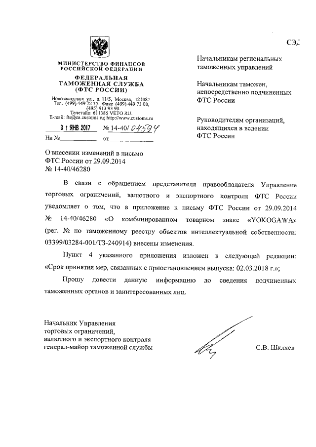 "О ВНЕСЕНИИ ИЗМЕНЕНИЙ В ПИСЬМО ФТС РОССИИ ОТ 29.09.2014 N 14-40/46280"