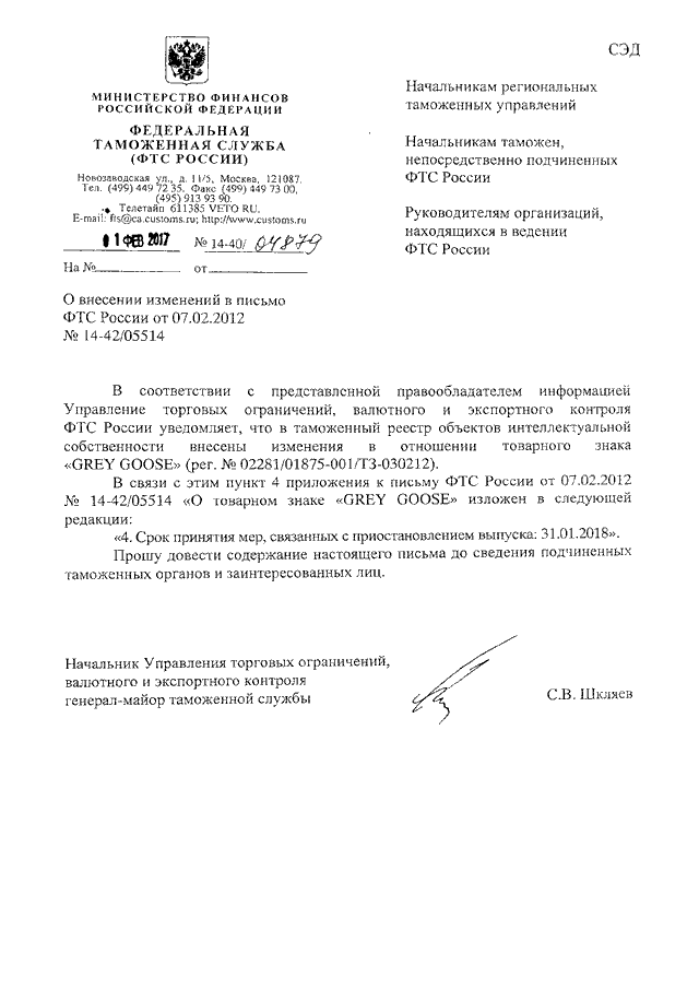 "О ВНЕСЕНИИ ИЗМЕНЕНИЙ В ПИСЬМО ФТС РОССИИ ОТ 07.02.2012 N 14-42/05514"