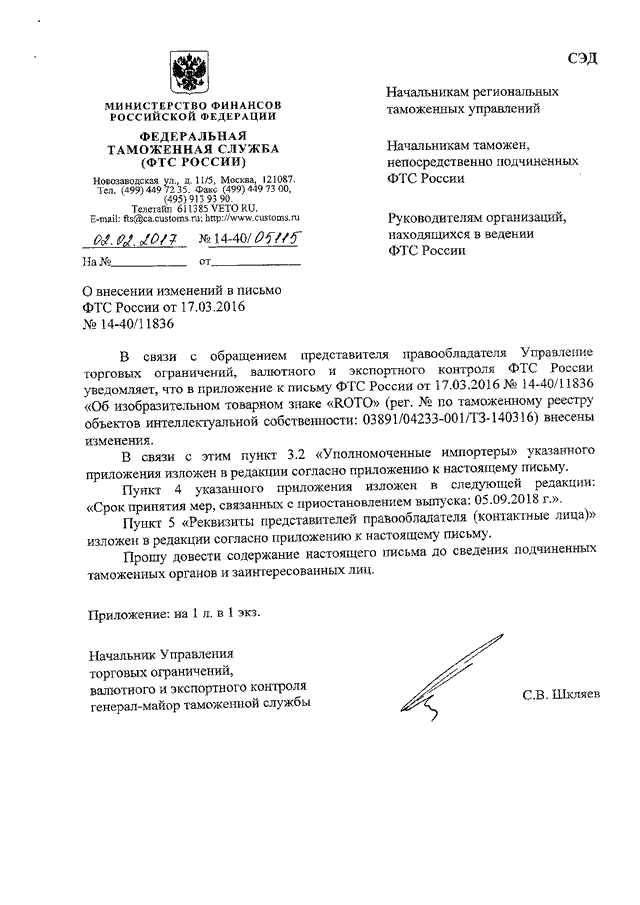 "О ВНЕСЕНИИ ИЗМЕНЕНИЙ В ПИСЬМО ФТС РОССИИ ОТ 17.03.2016 N 14-40/11836"