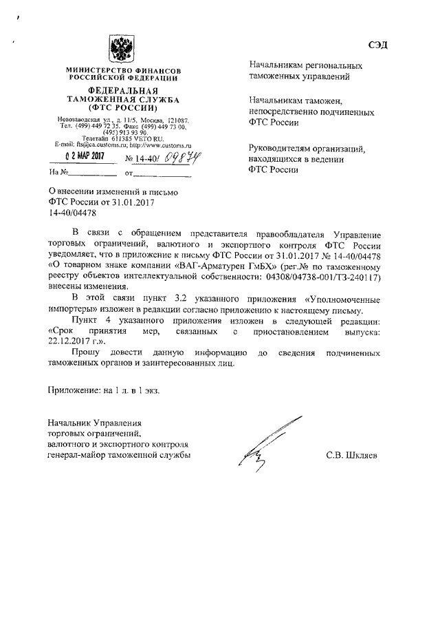 "О ВНЕСЕНИИ ИЗМЕНЕНИЙ В ПИСЬМО ФТС РОССИИ ОТ 31.01.2017 N 14-40/04478"