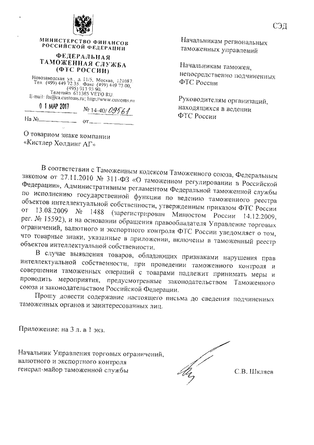 ПИСЬМО ФТС РФ от 01.03.2017 N 14-40/09561