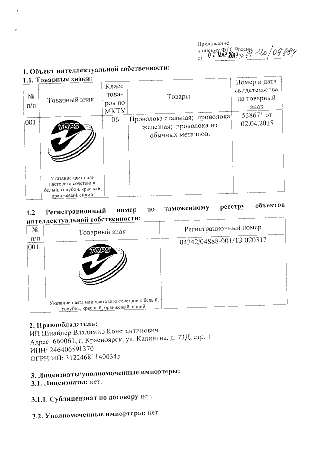 "О ТОВАРНОМ ЗНАКЕ "TOPS"
