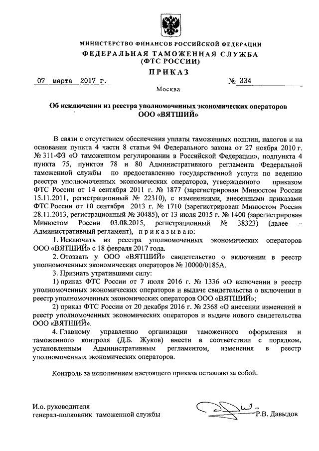 ПРИКАЗ ФТС РФ от 07.03.2017 N 334