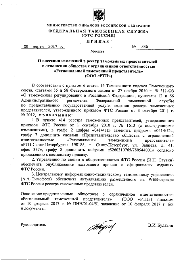 ПРИКАЗ ФТС РФ от 09.03.2017 N 345