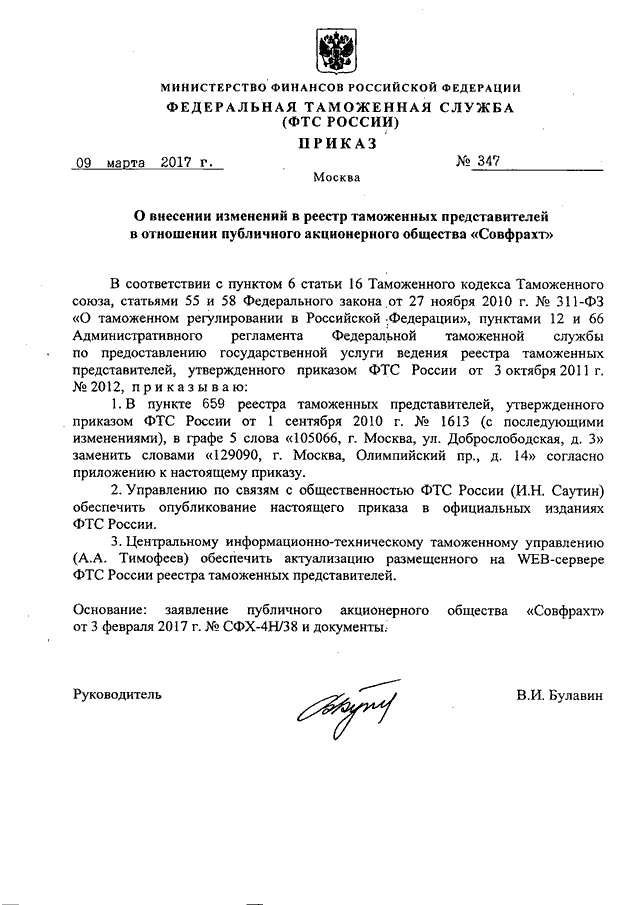 ПРИКАЗ ФТС РФ от 09.03.2017 N 347