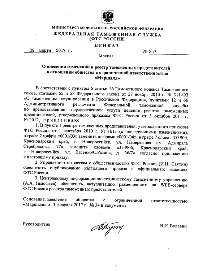 "О ВНЕСЕНИИ ИЗМЕНЕНИЙ В РЕЕСТР ТАМОЖЕННЫХ ПРЕДСТАВИТЕЛЕЙ В ОТНОШЕНИИ ОБЩЕСТВА С ОГРАНИЧЕННОЙ ОТВЕТСТВЕННОСТЬЮ "МАРШАЛЛ"