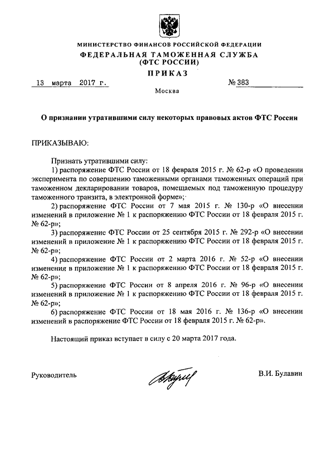 ПРИКАЗ ФТС РФ от 13.03.2017 N 383