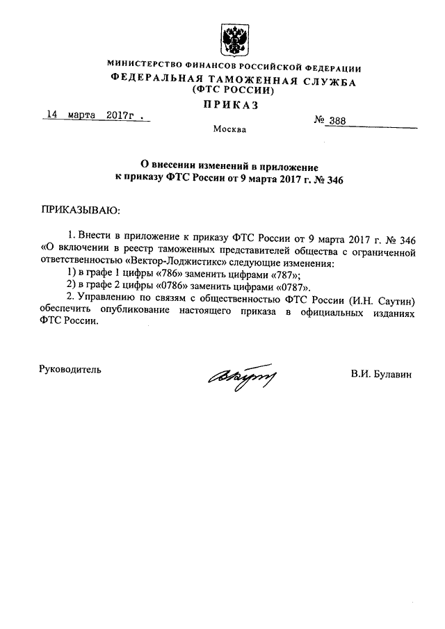 ПРИКАЗ ФТС РФ от 14.03.2017 N 388